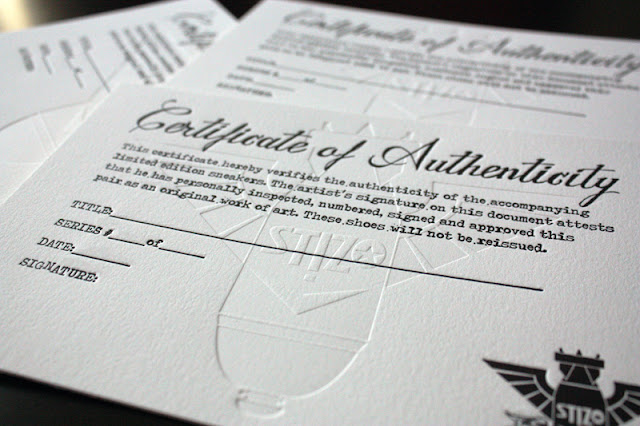 so when vince asked me to letterpress print his "Certificate of Authenticity" that will accompany each custom pair of shoes... i was more than happy to oblige. i tried printing on heavy duty 220lb lettra and good old chipboard... the blind deboss of the logo turned out better on the lettra...