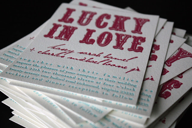 a few weeks after opening my etsy shop, i received my first etsy wedding invitation inquiry from a lovely bride named kasey. she had already designed her wedding invitation and was looking for a letterpress printer to bring the design to life... after a few emails, we struck a deal and just yesterday i finished packaging them and off to virginia they went. these invitations were the smallest {literally, the smallest in size} wedding invitations i've printed... good things come in small packages! congratulations kasey & charles! {be sure to read their response card options.. this couple has a sense of humor!}