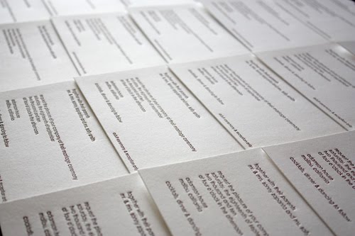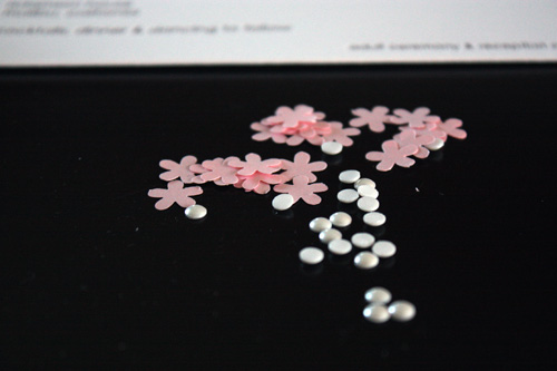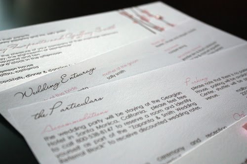 {mag plates printed on crane's 220 lb lettra in fluorescent white, reply card printed on coordinating 110 lb lettra, hand mixed ink, entourage and particulars inserts ink jet printed on 32 lb cotton paper, hand punched paper flower and pearl embellishment}