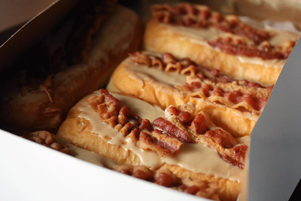 yep, that's bacon on top of the donuts! it has got to be the most unheatlhy donuts out there. i dislike bacon {not because it's fattening, i love fattening food, ha!} but my husband insisted i take a bite... it actually wasn't that bad. these healthy gems were bought at the donut den in joliet.
