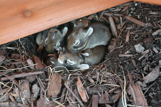 just yesterday though... my kids were playing on their playset when my son started screaming bloody murder that there was something in their playset... so i come running like a nut, thinking they've found a mouse or snake or something... but no. tucked at the base of their playset... MORE BABY BUNNIES.. seriously?! our backyard is no longer ours.