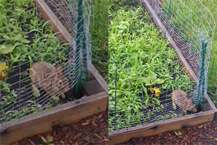 yes... there is a garden underneath all of those weeds... that's what happens when you go on vacation for 10 days during torrential rain storms. the picture on the left is the bunny {she doesn't look so fat here... but her belly was big} and the picture on the right is the bunny trying to make a quick escape after she hears me banging on the window like a maniac.