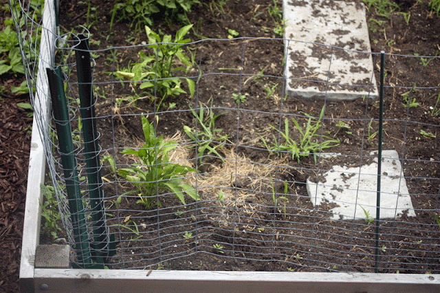 the weekend came and i spent hours pulling at the weeds. tired and dripping sweat, i reached for a pile of twigs and was stopped in my tracks. i screamed to my husband that there was a family of field mice in my garden. after closer inspection, we realized it was baby bunnies. the darn fat rabbit had her babies in my garden! {yes, i know... there are plenty more weeds that i still need to pick. can you see the baby bunnies though? look closely}