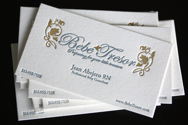 here are business cards i printed for bebe tresor {designed by her cousin josielyn roque}... gold and slate gray on pearl white lettra...
