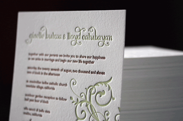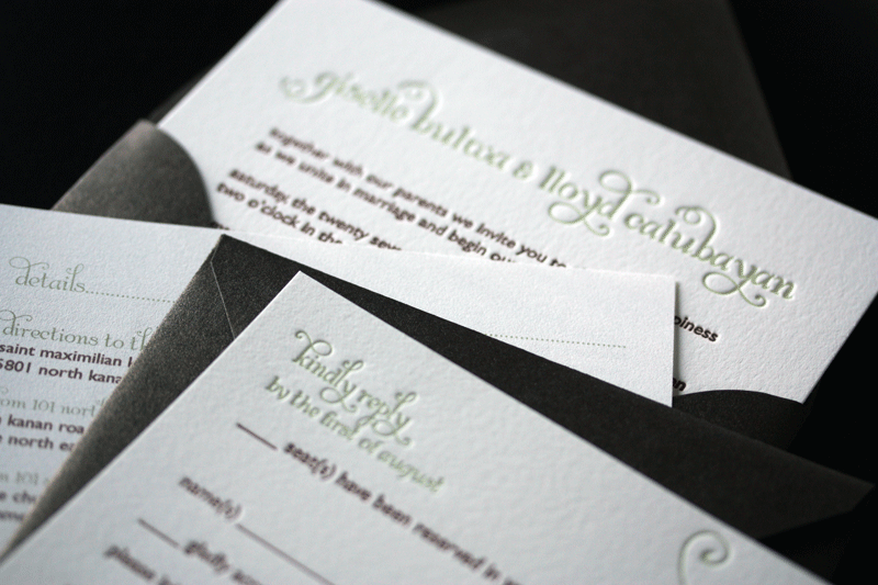 i'm so behind on blogging about the brides and grooms i have had the pleasure to work with lately... giselle and lloyd are no exception. some brides {and grooms, but it's mostly the bride} have an idea of what they envision for their wedding invitations while some need a little bit more direction. giselle though, is like no other bride i've ever met. when she approached me regarding her upcoming nuptials, i could not believe how organized she was! i was provided with a power point with invitation text, desired fonts, colors, and images from the web that were sources of inspiration. incredible! after just a little back and forth, the design was finalized. thank you giselle and lloyd for letting me create invites for your special day!